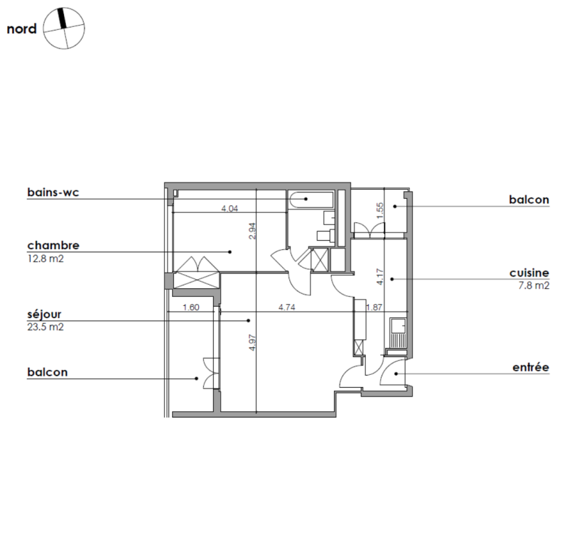 Appartement de 3 pièces au 1er étage comprenant : une entrée, un séjour donnant accès à un balcon, une chambre avec une armoire encastrée, une salle de bains avec WC et une cuisine agencée et équipée (hotte, cuisinière, four et lave-vaisselle) donnant accès à un petit balcon. Une cave est mise à disposition avec le logement, à bien plaire.