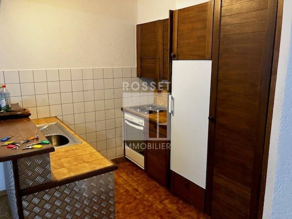 Cuisine ouverte équipée comme suit: plaques vitrocéram, four, frigo, lave-vaiselle.