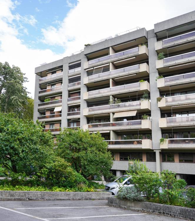 Grand hall avec réduit et WC visiteurs, séjour spacieux et lumineux avec accès au balcon, cuisine agencée et équipée d'une hotte, de plaques vitrocéramiques et d'un four - Couloir partie nuit desservant 2 chambres sur parc, une salle de bains avec branchement machine à laver et une salle de douche - cave. Parking intérieur possible en sus: CHF 200.--/mois