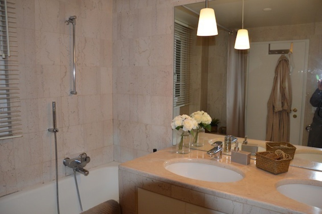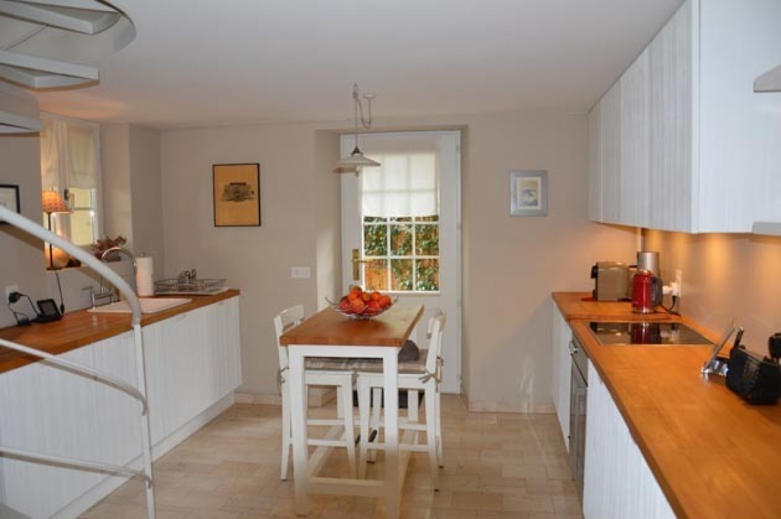 On y trouve, au rez-de-chaussée, la cuisine, entièrement équipée, avec accès au jardin, le coin à manger et la salle-de-bains/toilettes.