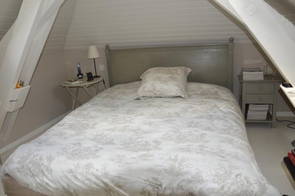 La mezzanine, sur le séjour, abrite la chambre à coucher au charme incroyable avec sa magnifique charpente apparente et ses deux vélux.